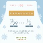 2025年12月29日 / 最終更新日時 : 2025年12月29日 ほっとるーむ新松戸STAFF お知らせ 年末年始のお知らせ 2025年もほっとるーむ新松戸をご利用いただきありがとうございました。 ほっとるーむ新松戸は、 2025年12月29日(月)〜2026年1月3日(土)まで 年末年始の休館になります。 新年は、1月4日(日)10:00〜開 […]