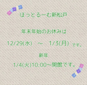 2021年12月28日 / 最終更新日時 : 2021年12月28日 ot*** お知らせ 年末年始お休みのお知らせ 予約なしでひろば利用ができるようになりました。 引き続きコロナウイルス感染拡大防止に努めながら 多くの親子さんに出会える日を楽しみにしています(^^♪ ~ほっとるーむ新松戸 スタッフ一同~ 予約不要で利用できます 【開館日】火・水・木・金・土・日10:00~18:00 相談員による子育て相談、オンライン広場等も行っています。詳しくは利用案内またはお知らせをご覧ください。 047-375-8737お問い合わせ FacebookXBlueskyHatenaCopy