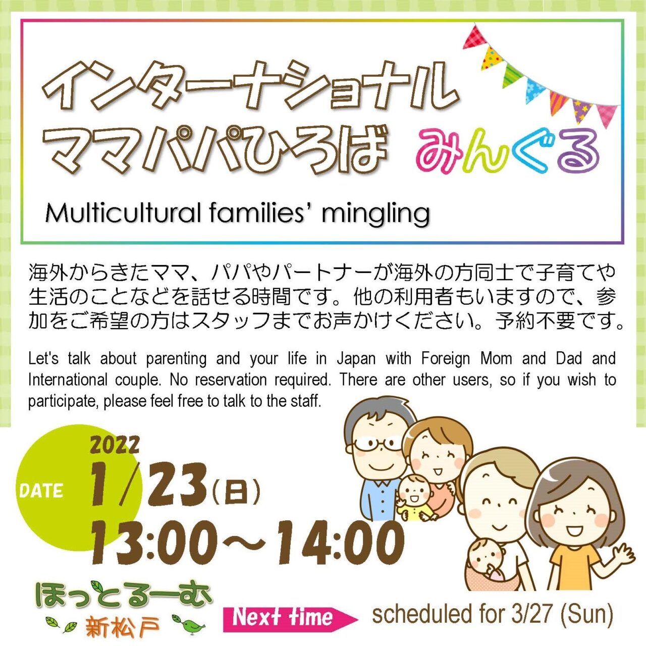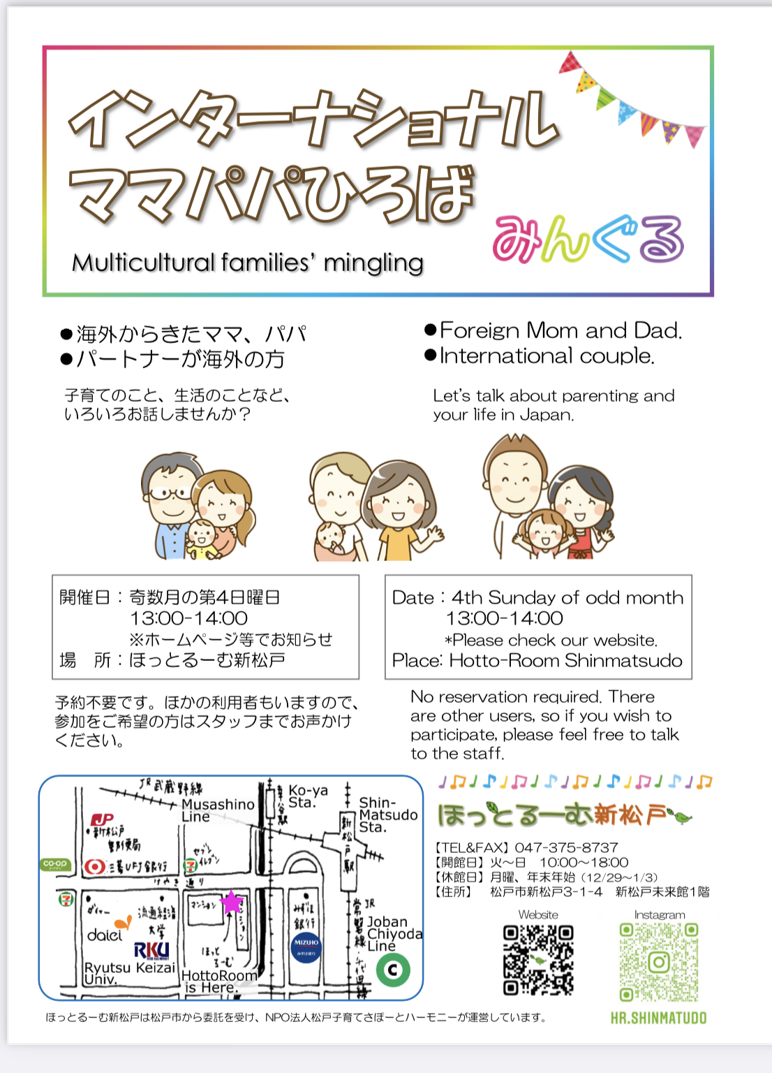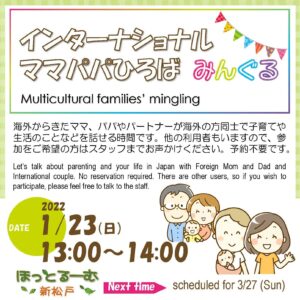 2022年1月11日 / 最終更新日時 : 2022年1月11日 ot*** お知らせ インターナショナルママパパひろば ファミリーでの参加、大歓迎です(^o^)/ 参加お待ちしています。 ※予約不要です。 予約不要で利用できます 【開館日】火・水・木・金・土・日10:00~18:00 相談員による子育て相談、オンライン広場等も行っています。詳しくは利用案内またはお知らせをご覧ください。 047-375-8737お問い合わせ FacebookXBlueskyHatenaCopy