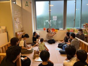はじめに参加者の方による英語の手遊び、絵本の読み聞かせがあり、一緒にリズムを取ったり声を出しみんな笑顔で和気あいあいに♪
