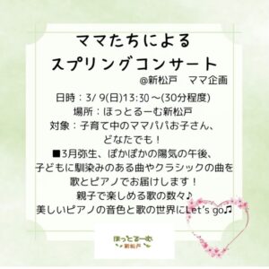 2025年3月5日 / 最終更新日時 : 2025年3月5日 ほっとるーむ新松戸STAFF お知らせ ママたちによるスプリングコンサート@新松戸 のお知らせ ☆ママたちによるスプリングコンサート@新松戸☆ [ママ企画] 日時:3/ 9(日)13:00〜(30分程度) 場所:ほっとるーむ新松戸 対象:子育て中のママパパお子さん、どなたでも! ■3月弥生、ぽかぽかの陽気の午後、子どもに馴染みのある曲やクラシックの曲を歌とピアノでお届けします!親子で楽しめる歌の数々♪美しいピアノの音色と歌の世界にLet’s go 予約不要で利用できます 【開館日】火・水・木・金・土・日10:00~18:00 相談員による子育て相談、オンライン広場等も行っています。詳しくは利用案内またはお知らせをご覧ください。 047-375-8737お問い合わせ FacebookXBlueskyHatenaCopy