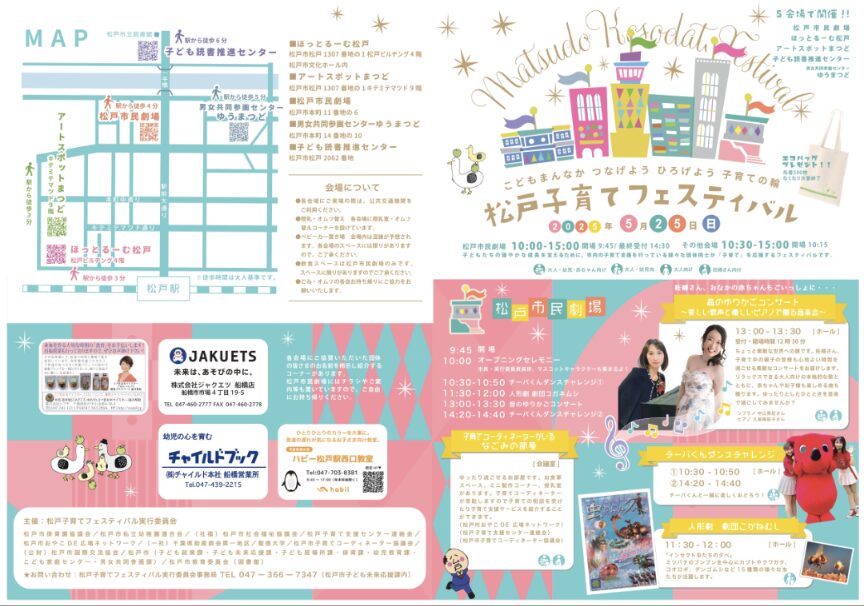 ■「松戸子育てフェスティバル」とは… 子育てを応援する市内の団体と市が連携をして子育て中のみなさまを応援するためのイベントです。子どもと楽しめる企画や、役立つ情報が盛りだくさんです。子育て中のママ、パパはもちろん、妊娠中の方や地域の方も是非お越しください!