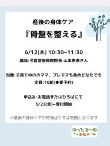 2025年6月3日 / 最終更新日時 : 2025年6月3日 ほっとるーむ新松戸STAFF お知らせ 産後の身体ケア「骨盤を整える」受付終了のお知らせ 6/12(木)実施予定 産後の身体ケア「骨盤を整える」は、 申し込み数が定員に達したため 受付を終了いたしました。 多数のお申込みをありがとうございました! 予約不要で利用できます 【開館日】火・水・木・金・土・日10:00~18:00 相談員による子育て相談、オンライン広場等も行っています。詳しくは利用案内またはお知らせをご覧ください。 047-375-8737お問い合わせ FacebookXBlueskyHatenaCopy