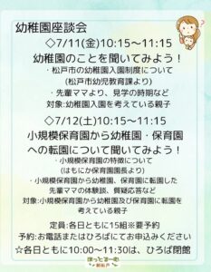 2025年6月27日 / 最終更新日時 : 2025年6月27日 ot*** お知らせ 幼稚園座談会のお知らせ ☆幼稚園座談会を下記の日時に開催します。 ☎️047-375-8737(ほっとるーむ新松戸) 予約不要で利用できます 【開館日】火・水・木・金・土・日10:00~18:00 相談員による子育て相談、オンライン広場等も行っています。詳しくは利用案内またはお知らせをご覧ください。 047-375-8737お問い合わせ FacebookXBlueskyHatenaCopy