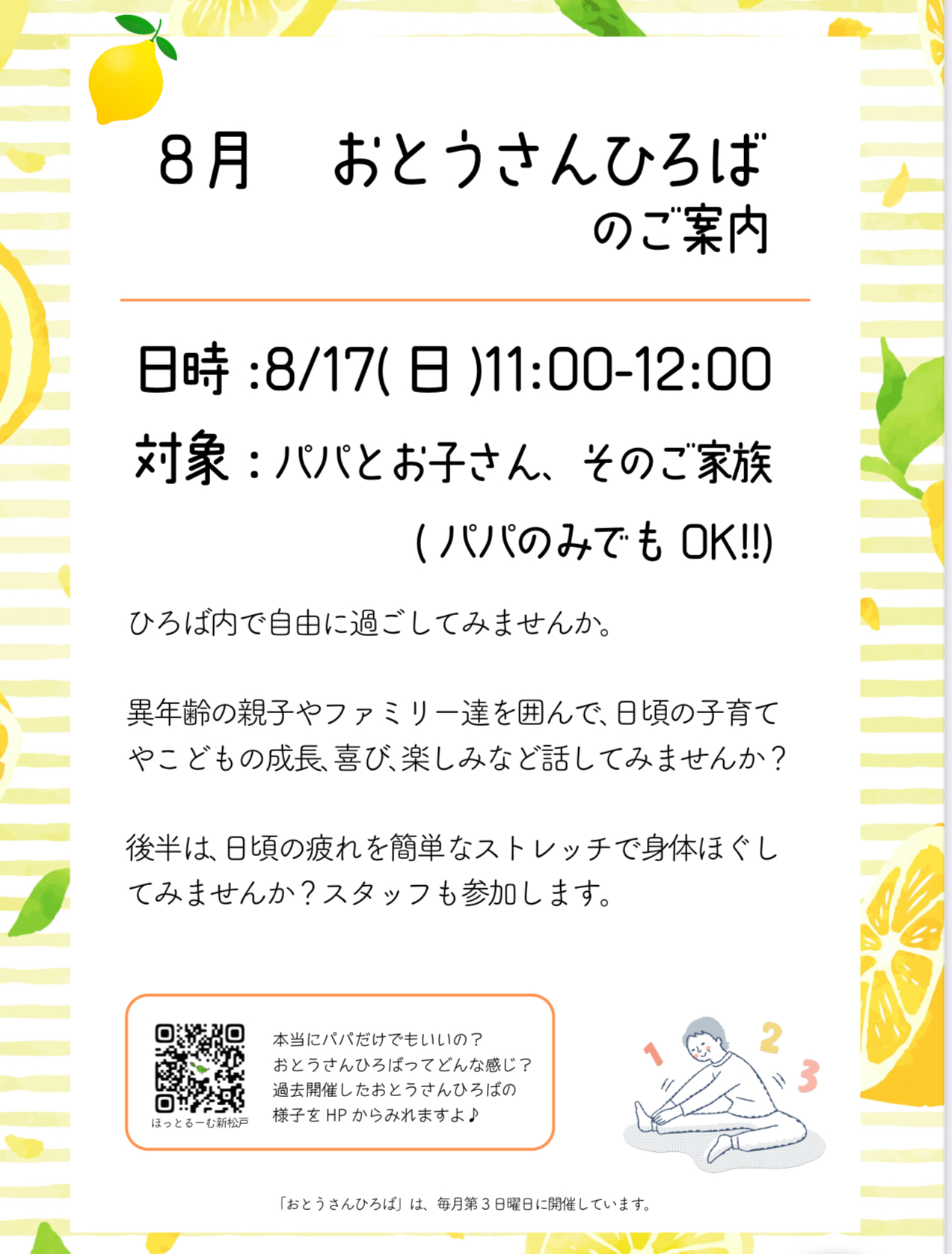 2025年8月8日 / 最終更新日時 : 2025年8月8日 ほっとるーむ新松戸STAFF お知らせ 8月 おとうさんひろばのご案内 ☆おとうさんひろば☆ 日時:8/17(日) 11:00~12:00 対象:パパとお子さん、そのご家族、 (パパのみでもOK) ■ノンプログラムでひろば内で親子で自由に親子で過ごしていただきます。異年齢の親子やファミリーたちを囲んで、日頃の子育てや親子の成長、喜び、楽しみなどを話してみませんか? 後半は、日頃の疲れを簡単なストレッチで身体をほぐしてみませんか?スタッフを参加いたします。 【毎月第3日曜日開催】 予約不要で利用できます 【開館日】火・水・木・金・土・日10:00~18:00 相談員による子育て相談、オンライン広場等も行っています。詳しくは利用案内またはお知らせをご覧ください。 047-375-8737お問い合わせ FacebookXBlueskyHatenaCopy
