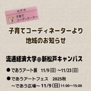 2025年11月7日 / 最終更新日時 : 2025年11月7日 ほっとるーむ新松戸STAFF お知らせ 11/9(日) 13:00〜15:00 ひろばを閉館します ☆閉館日時のお知らせ☆ 11/9(日) 13:00〜15:00 『ママパパ学級3日目』実施のため ひろばを閉館します。 参加される方のみご利用できます。。 15:00〜通常開館です。 よろしくお願いします。 予約不要で利用できます 【開館日】火・水・木・金・土・日10:00~18:00 相談員による子育て相談、オンライン広場等も行っています。詳しくは利用案内またはお知らせをご覧ください。 047-375-8737お問い合わせ FacebookXBlueskyHatenaCopy
