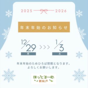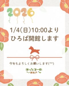2026年1月7日 / 最終更新日時 : 2026年1月7日 ほっとるーむ新松戸STAFF お知らせ 新年のご挨拶 今年もみなさんにとって、 ほっとひと息つける場所でありますように…。 今年は、どんな出会いが待っているのかな〜 スタッフ一同、楽しみにしています^^ 本年もどうぞよろしくお願いします。 予約不要で利用できます 【開館日】火・水・木・金・土・日10:00~18:00 相談員による子育て相談、オンライン広場等も行っています。詳しくは利用案内またはお知らせをご覧ください。 047-375-8737お問い合わせ FacebookXBlueskyHatenaCopy