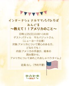 2026年1月23日 / 最終更新日時 : 2026年1月23日 ほっとるーむ新松戸STAFF お知らせ インターナショナルママパパひろば みんぐるのお知らせ ☆インターナショナルママパパひろば みんぐるのお知らせ☆ 日時:1/25(日)13:00〜14:00 ※予約不要 ゲスト:パティル・サルバジットさん(アメリカニューヨーク出身) 対象:アメリカについて興味のある方、どなたでも! 内容:アメリカの手遊び、絵本の読み聞かせ、アメリカについてのおしゃべりタイム♪ 【奇数月第4日曜日開催】 予約不要で利用できます 【開館日】火・水・木・金・土・日10:00~18:00 相談員による子育て相談、オンライン広場等も行っています。詳しくは利用案内またはお知らせをご覧ください。 047-375-8737お問い合わせ FacebookXBlueskyHatenaCopy
