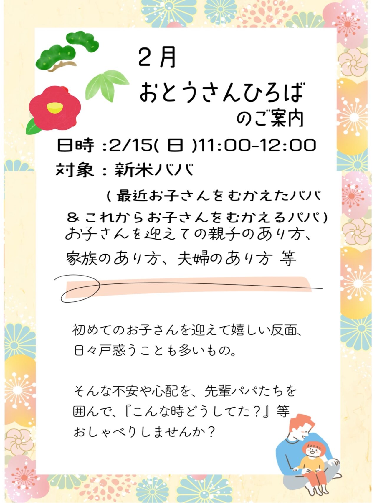 2026年2月6日 / 最終更新日時 : 2026年2月6日 ほっとるーむ新松戸STAFF お知らせ おとうさんひろばのご案内 ☆おとうさんひろば☆ 日時:2/15(日) 11:00〜12:00 対象:新米パパ(最近お子さんを迎えたパパ&これからお子さんを迎えるパパ) ■初めてお子さんを迎えて嬉しい反面、日々戸惑うことも多いもの。そんな不安や心配を、先輩パパ達を囲んで『こんな時どうしてた?』等、おしゃべりしませんか? おとうさんひろばは【毎月第3日曜日開催】しています。 予約不要で利用できます 【開館日】火・水・木・金・土・日10:00~18:00 相談員による子育て相談、オンライン広場等も行っています。詳しくは利用案内またはお知らせをご覧ください。 047-375-8737お問い合わせ FacebookXBlueskyHatenaCopy