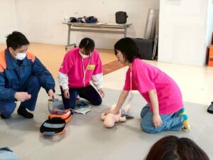 馬橋消防署の隊員の皆さんのご協力のもと、20組55名の親子が参加。人形を使った胸骨圧迫やAED体験など、緊急時の対処法を真剣に学びました。