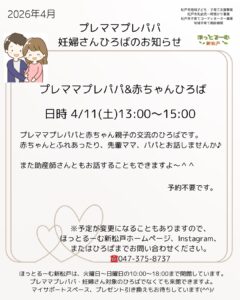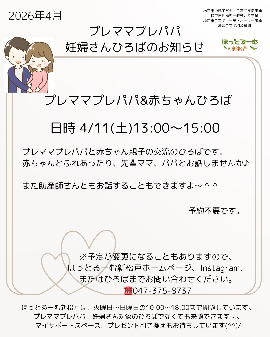 2026年4月5日 / 最終更新日時 : 2026年4月5日 ot*** お知らせ 2026年4月プレママプレパパ妊婦さんひろばのお知らせ 2026年4月プレママプレパパ・妊婦さんひろばのお知らせ ☎️047-375-8737(ほっとるーむ新松戸) いつでもお気軽にお立ち寄りくださいね~ マイサポートスペースプレゼントの引き換えもできますよ(^O^) Screenshot 予約不要で利用できます 【開館日】火・水・木・金・土・日10:00~18:00 相談員による子育て相談、オンライン広場等も行っています。詳しくは利用案内またはお知らせをご覧ください。 047-375-8737お問い合わせ FacebookXBlueskyHatenaCopy