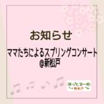 2025年3月5日 / 最終更新日時 : 2025年3月5日 ほっとるーむ新松戸STAFF お知らせ ママたちによるスプリングコンサート@新松戸 のお知らせ ☆ママたちによるスプリングコンサート@新松戸☆ [ママ企画] 日時:3/ 9(日)13:00〜(30分程度) 場所:ほっとるーむ新松戸 対象:子育て中のママパパお子さん、どなたでも! ■3月弥生、ぽかぽかの陽気の午後、子 […]