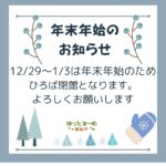 2024年12月28日 / 最終更新日時 : 2024年12月28日 ot*** お知らせ 年末年始のお知らせ 2024年もほっとるーむ新松戸をご利用いただきありがとうございました。 年末年始は、 2024年12月29日(日)~2025年1月3日(金)までお休みです。 2025年1月4日(土)10:00から開館します。 2025年 […]