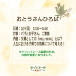 2025年1月4日 / 最終更新日時 : 2025年1月4日 ot*** お知らせ 1月のおとうさんひろば内容変更のお知らせ ☆1月のおとうさんひろば内容変更のお知らせ☆ 「ハイハイレース」延期のため おとうさんひろばは内容を変更して下記の通り実施します。 日時:1/19(日)13:00~14:00 対象:パパとお子さん、ご家族 内容:父親とし […]
