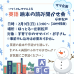 2025年1月22日 / 最終更新日時 : 2025年1月26日 ほっとるーむ新松戸STAFF お知らせ 「英語 絵本の読み聞かせ会@新松戸」のお知らせ 日時∶2/9(日) 13:00〜(30分程度) 場所:ほっとるーむ新松戸 対象:子育て中のママパパお子さん、どなたでもご参加ください! 申込み∶不要 ■英語の絵本や手遊びを通して、楽しく英語にふれてみませんか? 英語がわ […]