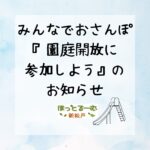 2025年10月2日 / 最終更新日時 : 2025年10月2日 ほっとるーむ新松戸STAFF お知らせ みんなでおさんぽ『園庭開放に参加しよう』のお知らせ ☆みんなでおさんぽのお知らせ☆ 『園庭開放に参加しよう』 日時:10/14(火) 行き先:新松戸中央保育所 ・新松戸中央保育所集合 9:30 ・園庭開放 9:45〜10:45 定員:10組程度(◆予約制) ※園庭開放後、 […]