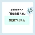2025年6月3日 / 最終更新日時 : 2025年6月3日 ほっとるーむ新松戸STAFF お知らせ 産後の身体ケア「骨盤を整える」受付終了のお知らせ 6/12(木)実施予定 産後の身体ケア「骨盤を整える」は、 申し込み数が定員に達したため 受付を終了いたしました。 多数のお申込みをありがとうございました!