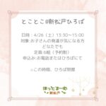 2025年4月19日 / 最終更新日時 : 2025年4月19日 ほっとるーむ新松戸STAFF お知らせ とことこひろば@新松戸のお知らせ とことこひろば@新松戸のおしらせ 日時:4/26(土) 13:30〜15:00 対象:発達が気になる方、どなたでも 定員:6組 予約制 お申込み:お電話またはひろばまでお願いします 今回は運動療育に力を入れているたくみと […]