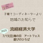 2025年7月1日 / 最終更新日時 : 2025年7月1日 ほっとるーむ新松戸STAFF お知らせ 子育てコーディネーターより地域のお知らせ 流通経済大学 新松戸キャンパスにて 「海の日アートフェス 遊びのひろば」を開催します。 日時:7/13(日) 11:00~15:30 (入場無料・出入り自由) 場所:流通経済大学 新松戸キャンパス RKUスクエア 【プロ […]